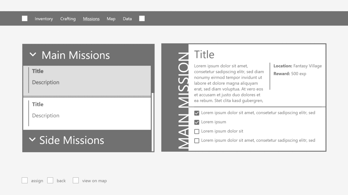 Inventory, Missions and HUD Screens - From Wireframe to High Fidelity Mockup